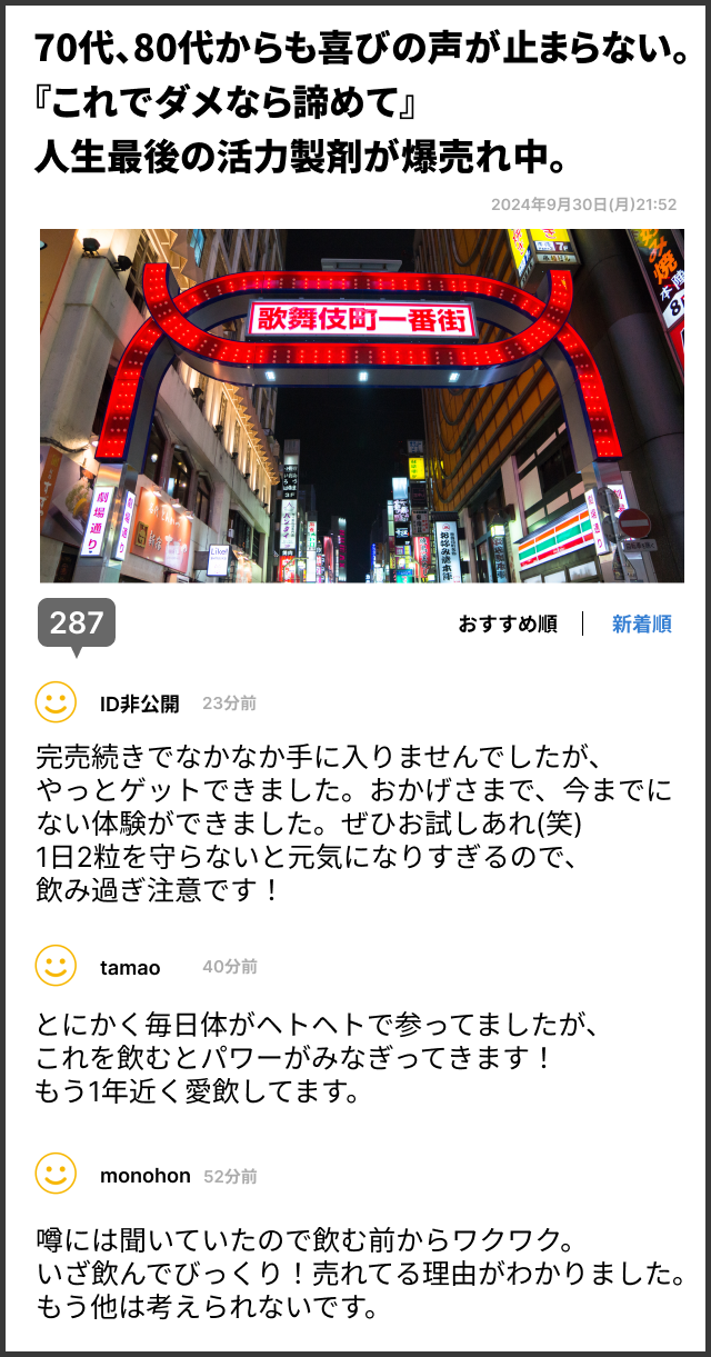 亜鉛やシトルリンなどサプリは散々試してきましたが、どれもピンとくるものがなく…。友人に勧められて試してみたら、20代の頃のようなパワーがみなぎってきて驚きました。ニオイがしないのも気に入っています。